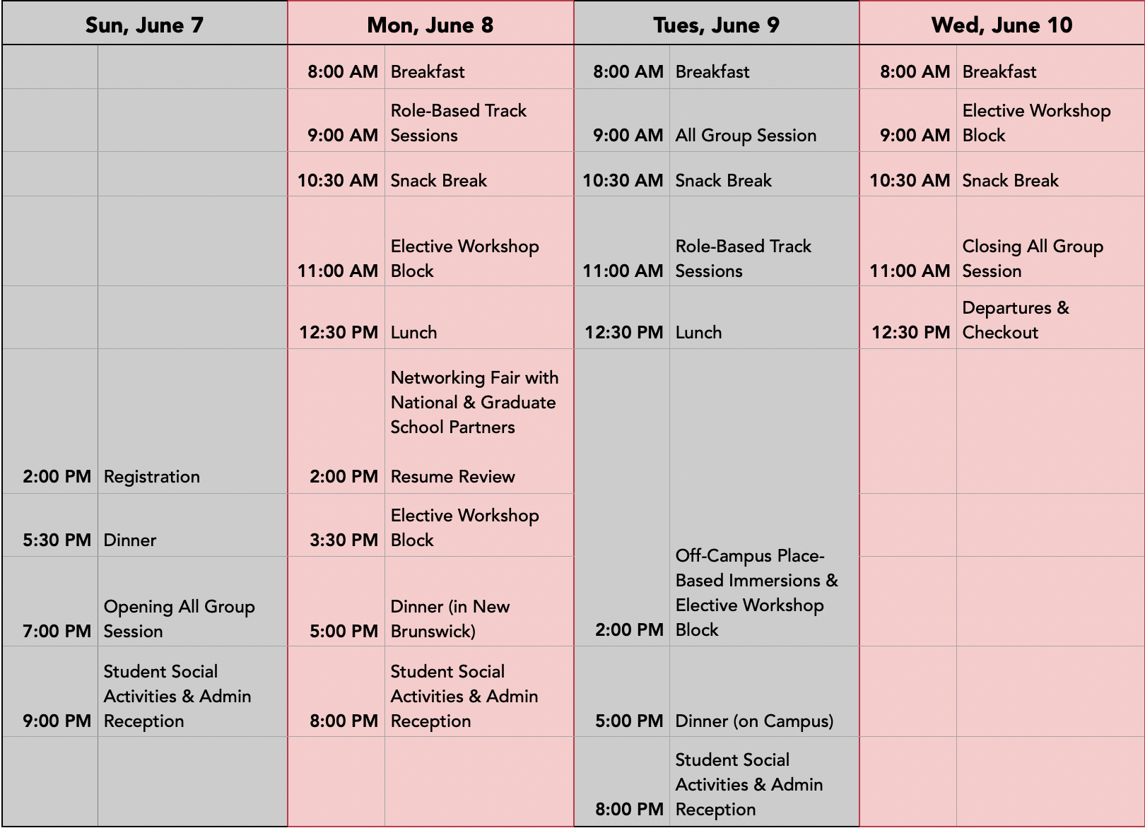 Format includes all-group sessions, role-based tracks, workshops, and place-based immersion experiences with community partners