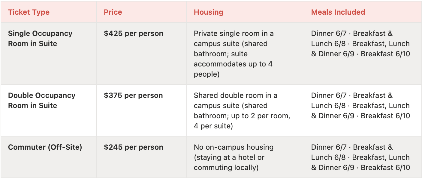 All ticket types include full access to all SLI programming, workshops, place-based immersions, snack breaks, receptions, and meals (see below).