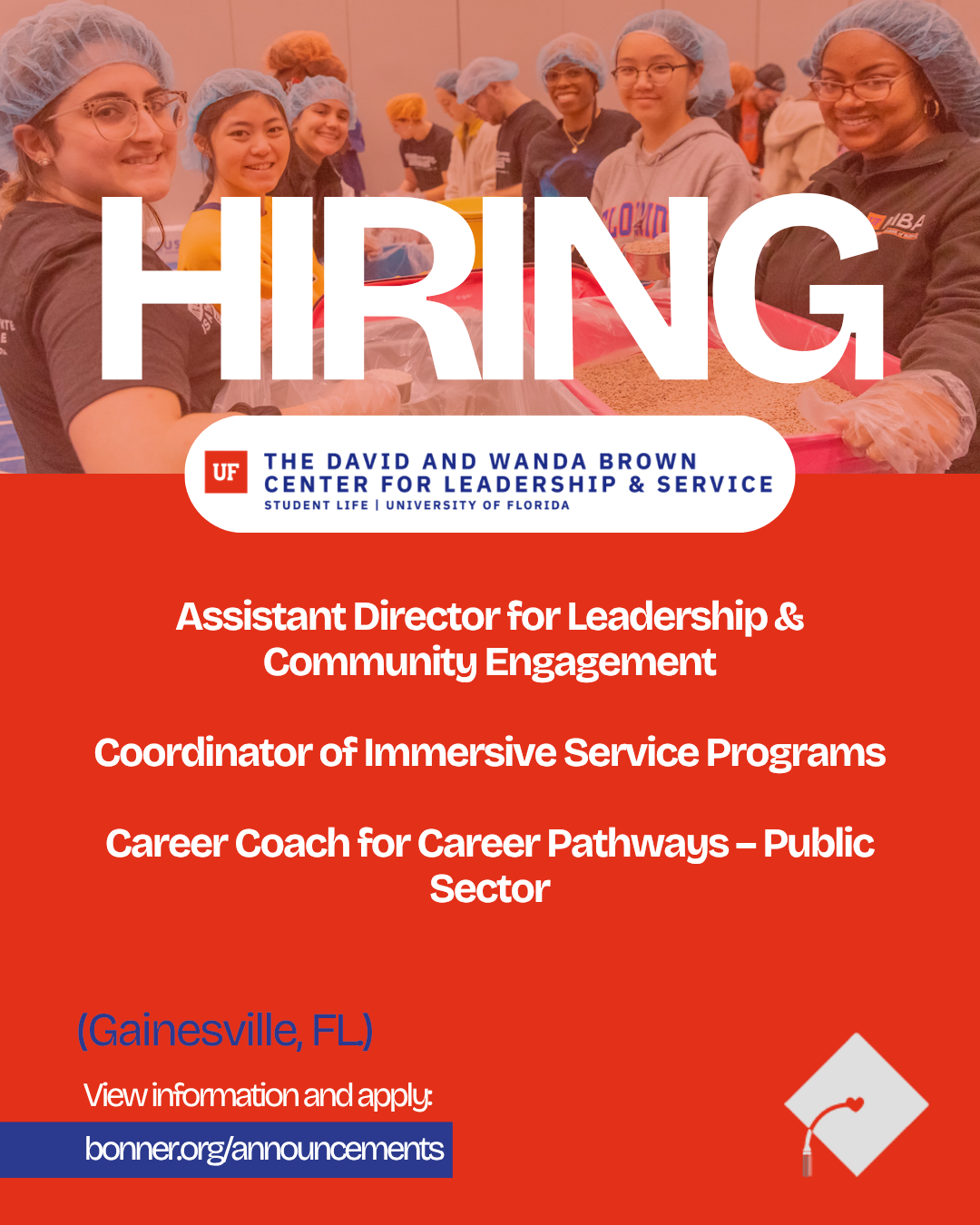 Join the University of Florida’s Brown Center for Leadership and Service team! The center serves as the hub on campus for community engagement, service-learning and leadership development.