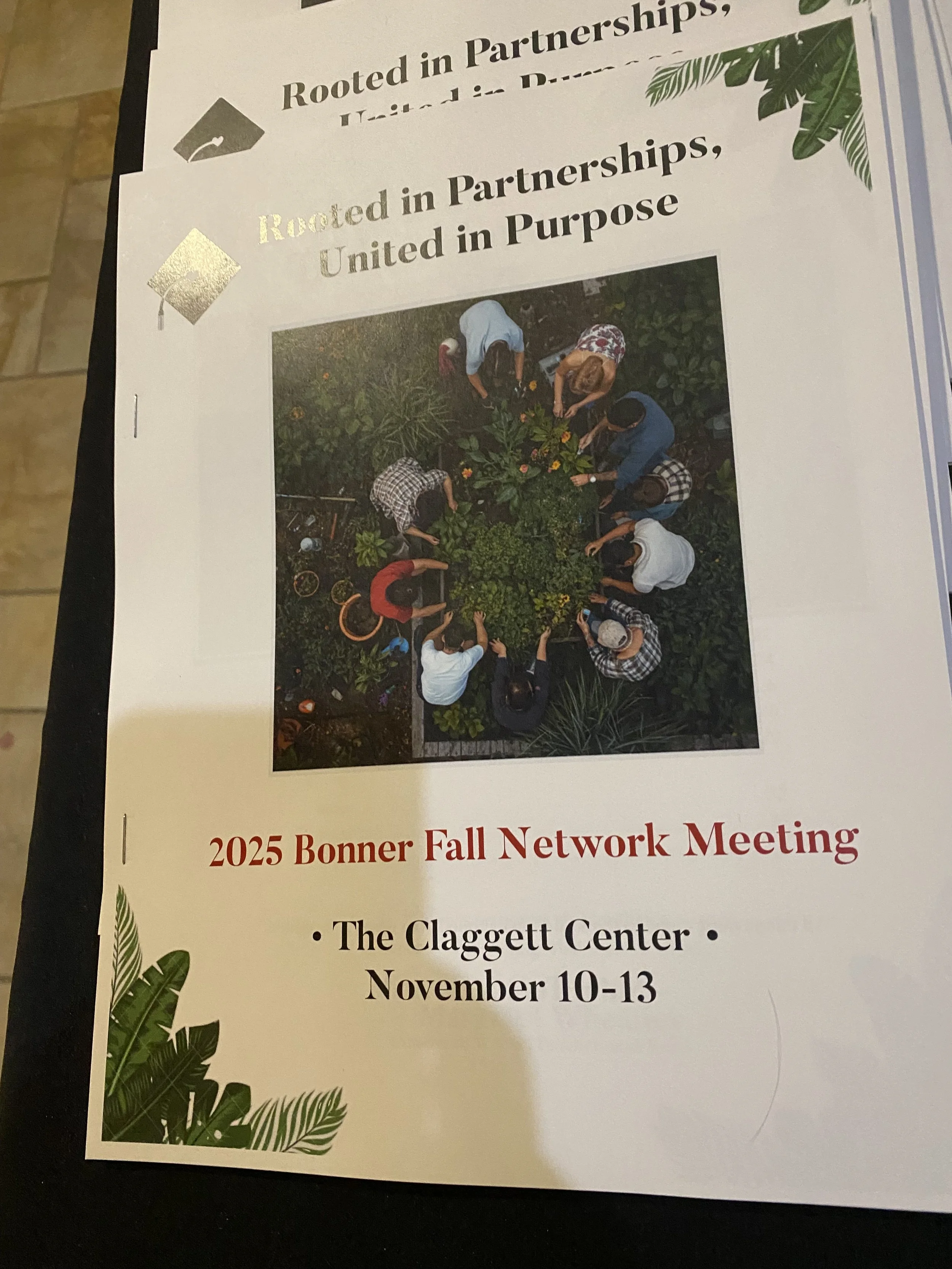 The 2025 Bonner Fall Network Meeting convened November 10-13 at the Claggett Center in Adamstown, Maryland, bringing together 100 administrators, faculty, and partners from 52 institutions across the Bonner Network. Addressing the theme Rooted in Partnerships, United in Purpose, the gathering provided a space for professional development, strategic planning, and community building as staff and faculty from across the Bonner Network explored how their work with civic learning and community engagement addresses critical challenges facing campuses, communities, and the nation. Throughout the four-day gathering, attendees engaged in strategy sessions, elective workshops, design clinics, and social activities designed to strengthen relationships and build capacity for their work back home.
